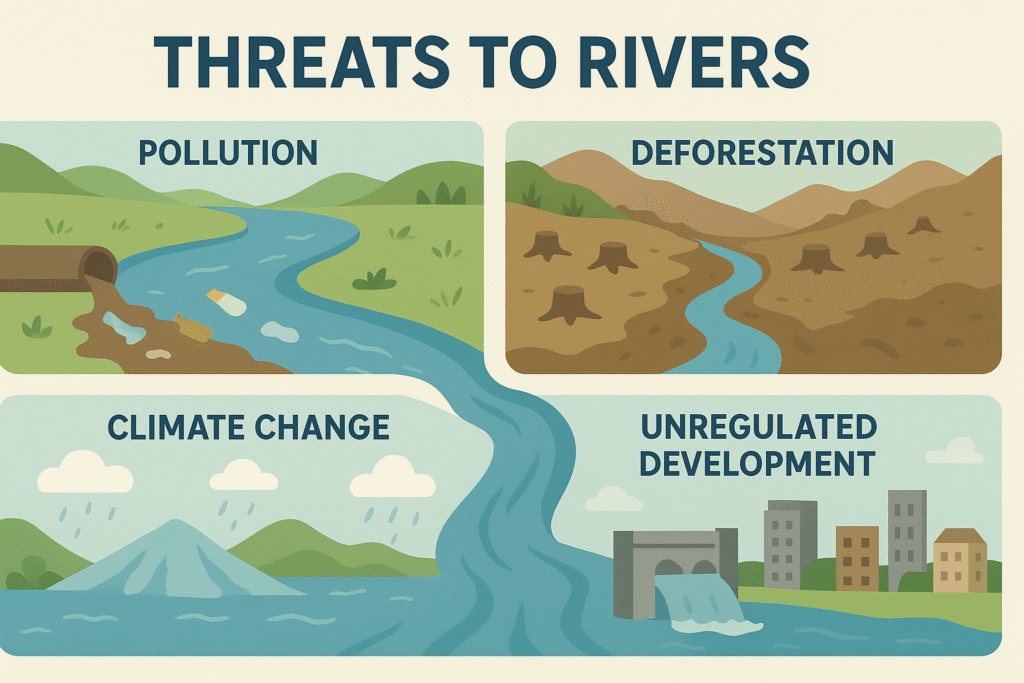- Climate Change – Melting glaciers and erratic rainfall are altering river flows. Floods and droughts are becoming more frequent, threatening both people and biodiversity.